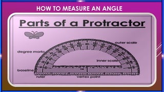 This document provides an overview of geometry concepts to be covered in a 5th grade mathematics class. It will discuss basic geometry symbols, how angles are formed, types of angles including acute, obtuse, right, straight and complementary/supplementary angles. It will also cover using a protractor to measure and draw angles.