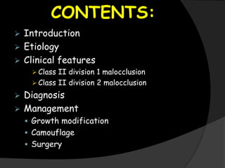 This document discusses the classification, etiology, clinical features, diagnosis, and management of Class II malocclusions. It describes two main types, Class II division 1 characterized by a distally placed mandible and Class II division 2 by a protruded maxilla. Etiology may include hereditary factors or trauma influencing jaw growth. Clinical features and intraoral examination are used for diagnosis. Management approaches include growth modification using headgear or myofunctional appliances, camouflage treatment using extractions or elastics, or in severe cases, jaw surgery.
