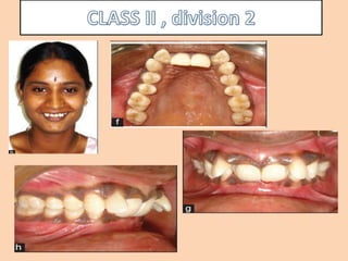 Edward Angle developed a classification system for malocclusions in 1899 that categorized them into three main classes based on the relationship of the mandible to the maxilla. Class I is considered normal with the mandible fitting correctly over the maxilla. Class II is when the mandible is positioned back from the maxilla, divided into two divisions. Class III is when the mandible is positioned forward from the maxilla. Angle described characteristics and causes for each class and subclassified them further. His system provides a framework for describing malocclusions based on skeletal relationships.