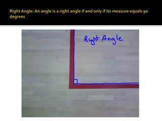 This document defines and describes different types of angles. It states that a right angle measures 90 degrees, an acute angle measures between 0 and 90 degrees, and an obtuse angle measures more than 90 degrees but less than 180 degrees. It also defines complementary angles as having a sum of 90 degrees, supplementary angles as having a sum of 180 degrees, and bisected and vertical angles formed by intersecting lines. A linear pair consists of two adjacent angles with noncommon sides, while opposite rays share an endpoint and are collinear.