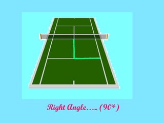 This document defines and provides examples of various types of angles used in geometry. It discusses right angles, obtuse angles, acute angles, vertical angles, supplementary angles, bisected angles, linear pairs, adjacent angles, and complementary angles. Examples images are provided to illustrate some of these angle concepts.