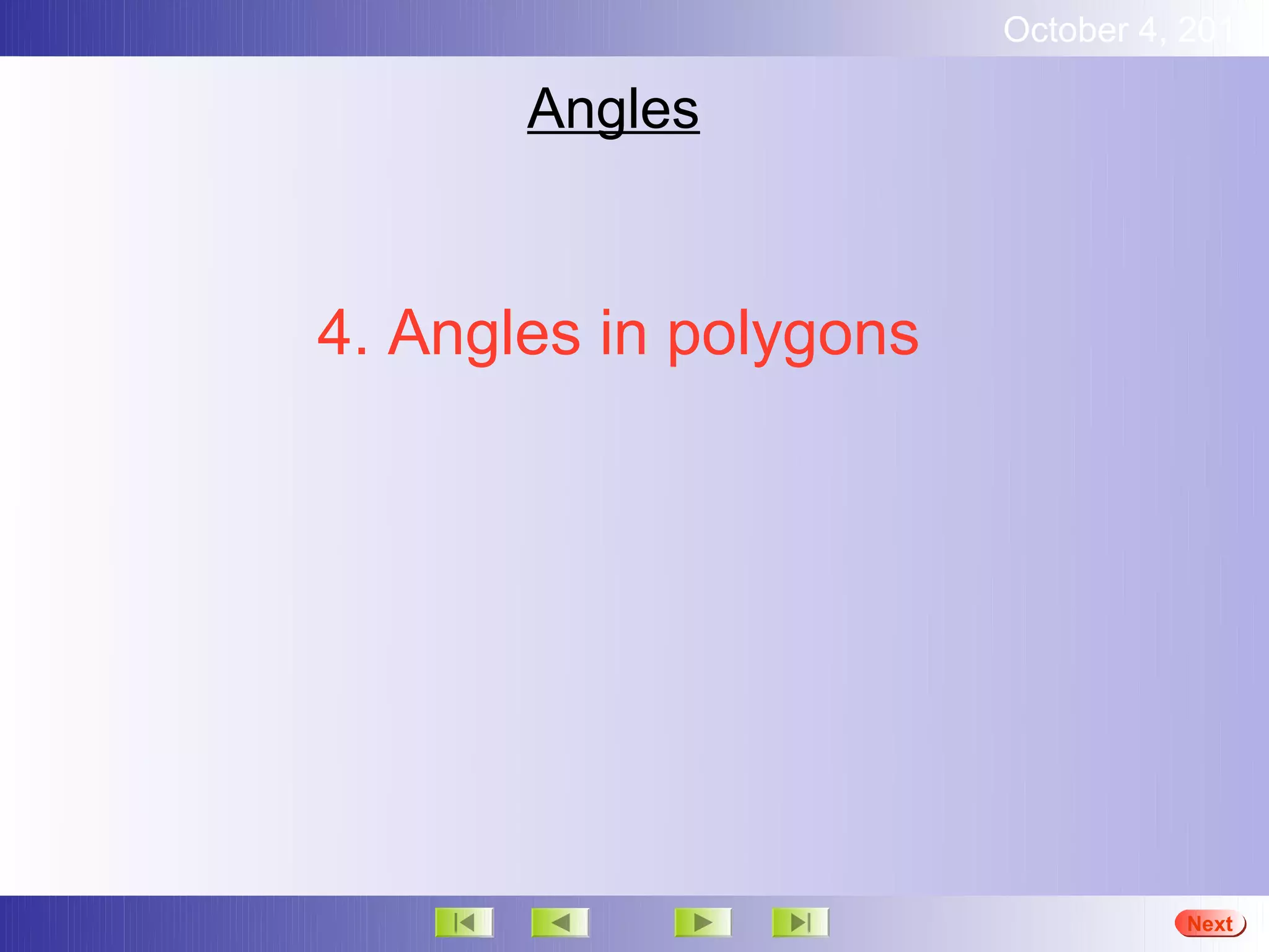 The document discusses angles in polygons. It states that the sum of the exterior angles of any convex polygon is 360 degrees. It also states that for any regular polygon, the sum of the interior and exterior angles at each vertex is 180 degrees. Finally, it provides a formula for calculating the sum of the interior angles of any n-sided convex polygon: the sum of the interior angles equals (180n - 360) degrees.