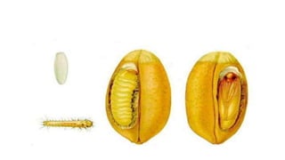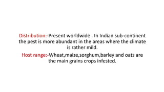 The Angoumois Grain Moth is present worldwide and more common in mild climates. It infests wheat, maize, sorghum, barley and oats. Females lay eggs on or near grains, and larvae bore into grains to feed. Larvae construct cocoons and pupate, then emerge as buff or brown moths. The moth completes its life cycle in 7 weeks, with multiple generations per year. Larval feeding can damage 30-50% of grain contents, causing an unpleasant odor. Proper drying and storage practices along with pesticide treatments can manage infestations.