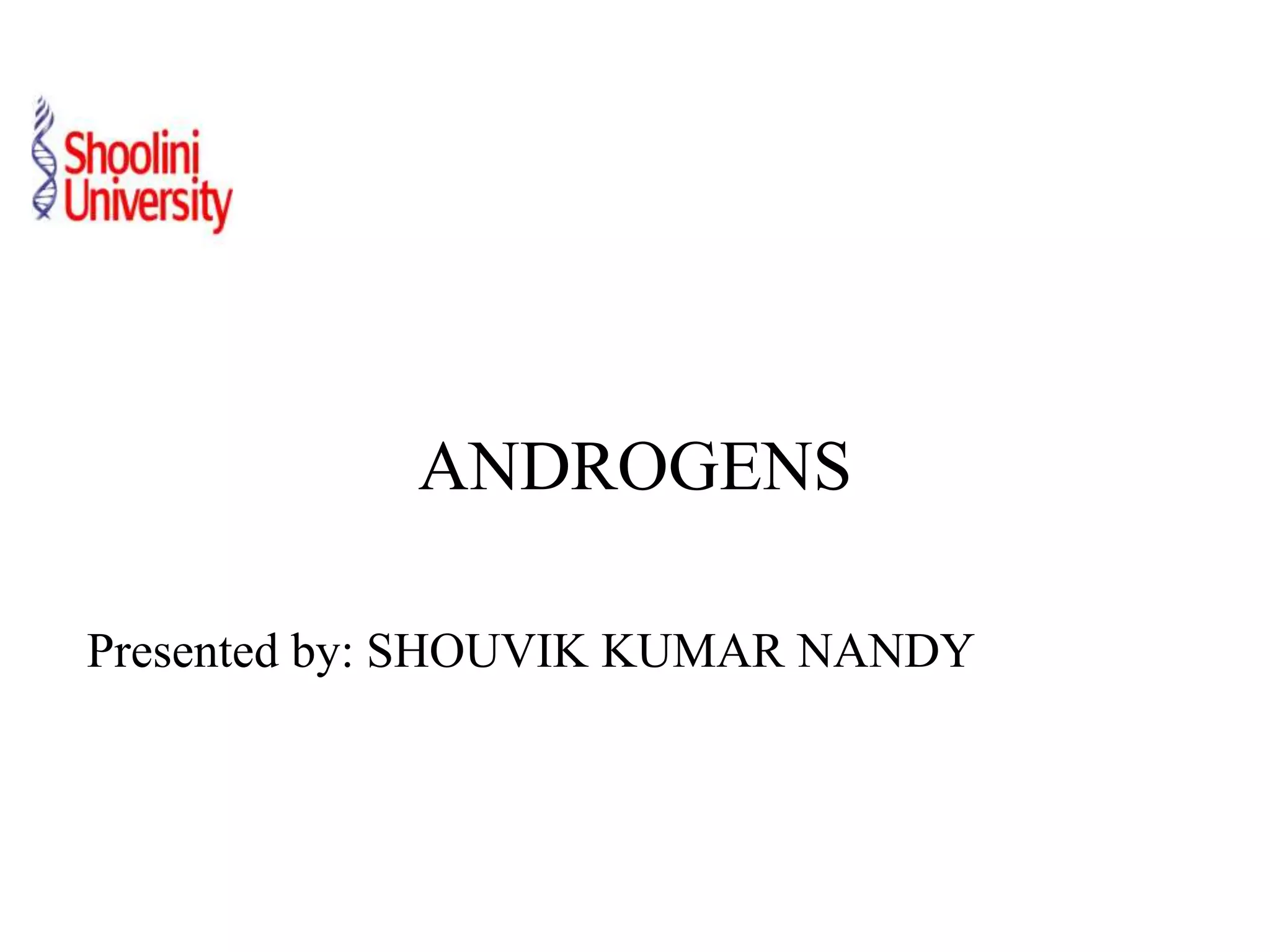 Androgens are a group of steroids that have masculinizing effects in both males and females. Testosterone is the most important androgen, produced primarily in the testes in males and in smaller amounts in ovaries and adrenal glands of both sexes. Androgens are required for normal male maturation, sperm production, muscle growth, and bone strength. They work by binding to nuclear receptors in target cells. Therapeutic uses include treatment of hypogonadism and wasting diseases, while adverse effects include acne, hair growth, and prostate issues. Antiandrogens can counter male hormonal actions and are used to treat prostate cancer.