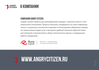 Компания Angry Citizen разрабатывает онлайн-проекты для улучшения взаимодействия граждан с государственными и коммерческими организациями, оптимизируя процесс подачи обращений и сбор данных. Основной продукт, федеральный портал 'Сердитый гражданин', позволяет пользователям жаловаться на товары и услуги, в то время как система 'Довольный гражданин' предназначена для управления обращениями от администраций городов и ведомств. Среди клиентов и партнеров компании — крупные городские администрации и экономические организации, а также международный венчурный фонд Runa Capital.