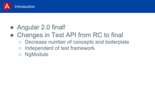 This document discusses unit testing in Angular 2. It introduces the Angular 2 test API and differences from previous versions. It then covers decisions to make when unit testing like what framework to use and how to set up tests. Finally, it provides recipes for unit testing different scenarios like simple components, components communicating with services, routing, and nested components. It emphasizes the importance of writing unit tests and lists resources for learning more about Angular testing.
