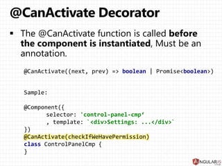 3) Lifecycle hooks for routing like CanActivate, OnActivate, etc. and using them for authorization