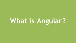 The document introduces AngularJS, an open-source JavaScript framework developed by Google for creating single-page applications (SPA). It explains essential concepts of AngularJS, including the use of TypeScript, the application structure, and the development environment setup using tools like Node.js and Angular CLI. Key components such as modules, components, services, and directives are defined, emphasizing their roles within the application.