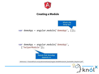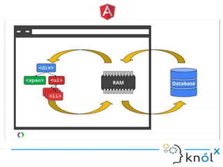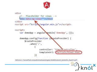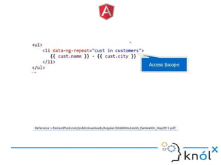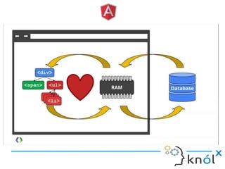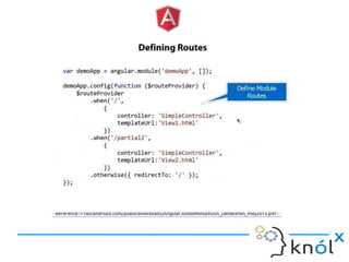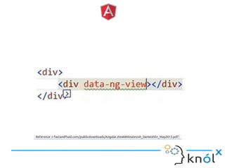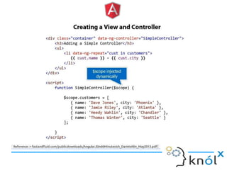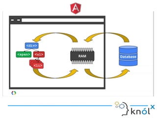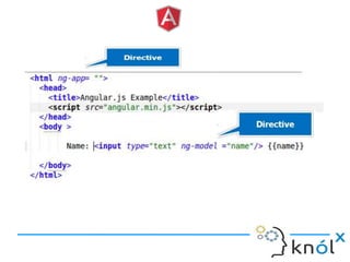 The document provides an overview of AngularJS, a JavaScript framework by Google for building single-page applications (SPAs) that focuses on dynamic web development with features like data binding and templating. It explains the framework's benefits, including simplifying development and enhancing testability, while clarifying what AngularJS is not, such as a JavaScript library or plugin. Additionally, it discusses key concepts like directives, factories, and the general structure for setting up an AngularJS application.