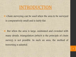 Compass surveying involves measuring magnetic bearings of survey lines using a compass and measuring distances using a chain or tape. There are two main types of compasses used: prismatic compasses and surveyor's compasses. Prismatic compasses have a magnetic needle, graduated circle, prism for sighting bearings, and other parts. Surveyor's compasses are similar but without a prism. Magnetic bearings are measured clockwise from magnetic north between 0-360 degrees in the whole circle system or 0-90 degrees with quadrant specification in the quadrantal system. Compass surveying is well-suited for large, irregular areas.