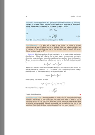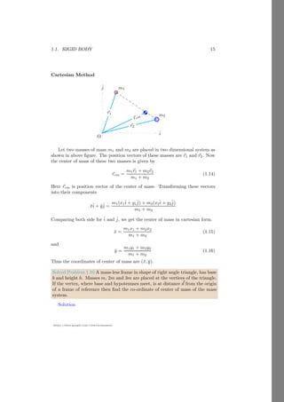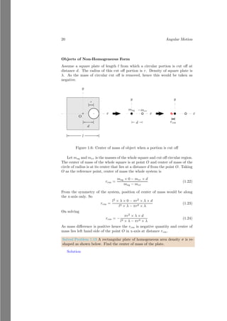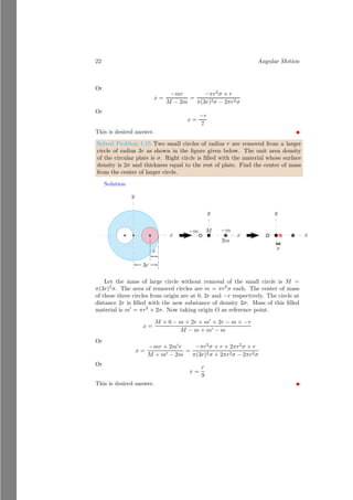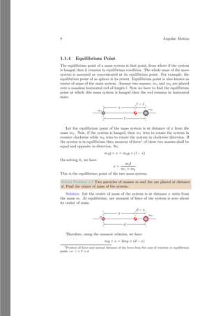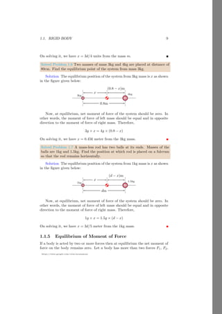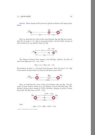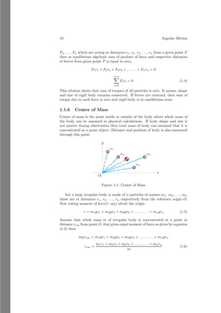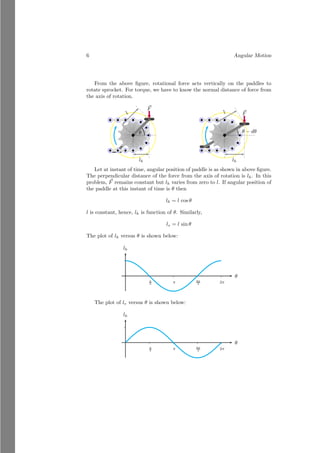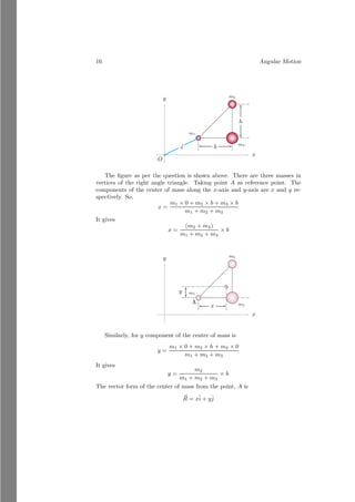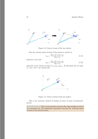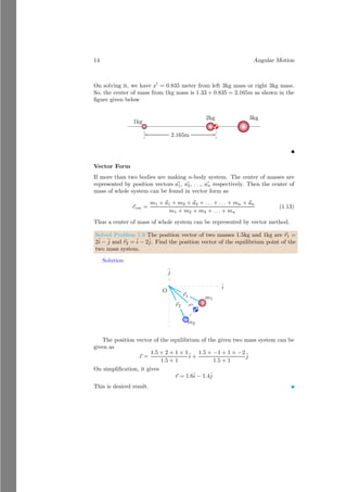 This document provides an introduction to angular motion, focusing on rigid bodies and concepts related to rotation, such as axis of rotation, moment of force (torque), equilibrium, and center of mass. It includes various subsections detailing specific topics, mathematical relations, and solved problems illustrating these concepts. The document serves as a comprehensive guide to understanding angular motion in physics.