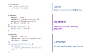 Компонент може використовувати різні сервіси, яким він делегує більшість завдань, які пов’язані із маніпуляціями над даними (калькуляція, валідація, взаємодія із сервером тощо)