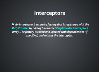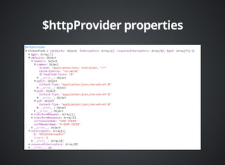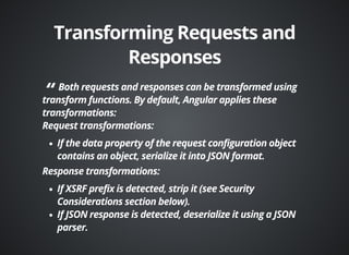 The document outlines the AngularJS $http service for communication with remote HTTP servers, detailing methods for making requests and handling responses. It discusses interceptor functionality for modifying requests and responses, as well as registering custom interceptors. It also describes the usage of the $resource service to create and manage resource instances for backend interaction.