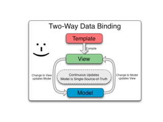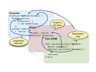 This document provides an overview of AngularJS including reasons to use it, tools for building AngularJS applications, libraries that integrate with AngularJS, testing frameworks, and additional resources. It lists generators, build tools, and libraries for mobile development. It also mentions code playgrounds, testing frameworks like Karma and Protractor, and topics covered in other AngularJS resources.