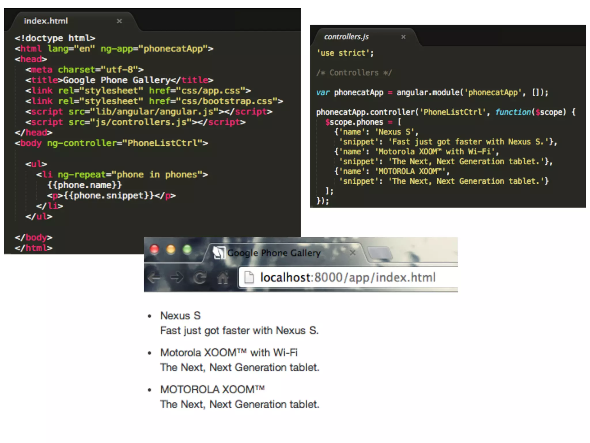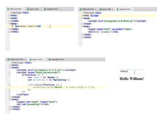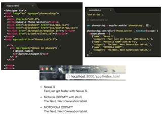 The document discusses AngularJS and its key features such as MVC architecture, dependency injection, enhanced HTML, and testing support. It outlines the three main processes that occur during application bootstrapping: creating the injector, establishing the root scope, and compiling the DOM. Additionally, it includes links to resources and social network information of the author.