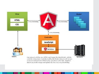 AngularJS è un framework MVC sviluppato da Google per la creazione di applicazioni web single page, che caricano dinamicamente le risorse in una singola pagina HTML. Utilizza componenti come direttive e servizi per estendere le funzionalità del DOM e semplificare la gestione dei dati attraverso tecniche come il data binding e l'injection di dipendenze. Inoltre, può essere utilizzato con Apache Cordova e Ionic per sviluppare applicazioni mobili funzionanti su diverse piattaforme.