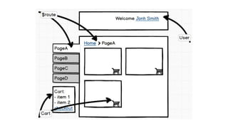 This document discusses AngularJS, a framework for building client-side web applications. It is divided into four parts. Part I provides background on AngularJS and its benefits like being test-driven development friendly. Part II contrasts imperative vs declarative programming and provides AngularJS code examples. Part III discusses how AngularJS is used for everyday work, separating frontend logic from backend logic. Part IV discusses using AngularJS for testing and automation. The document concludes with contact information and credits.