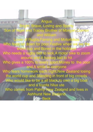 Angus is a bright, brave, and loving son from Palmy North, New Zealand who lives in Ashhurst. He enjoys sports like rugby, farming, and motorbikes and gives his all in every sport. Angus fears homework, New Zealand losing the World Cup, and public speaking. His dreams are to play for the All Blacks, own a boat, and drive a Toyota Hilux ute.