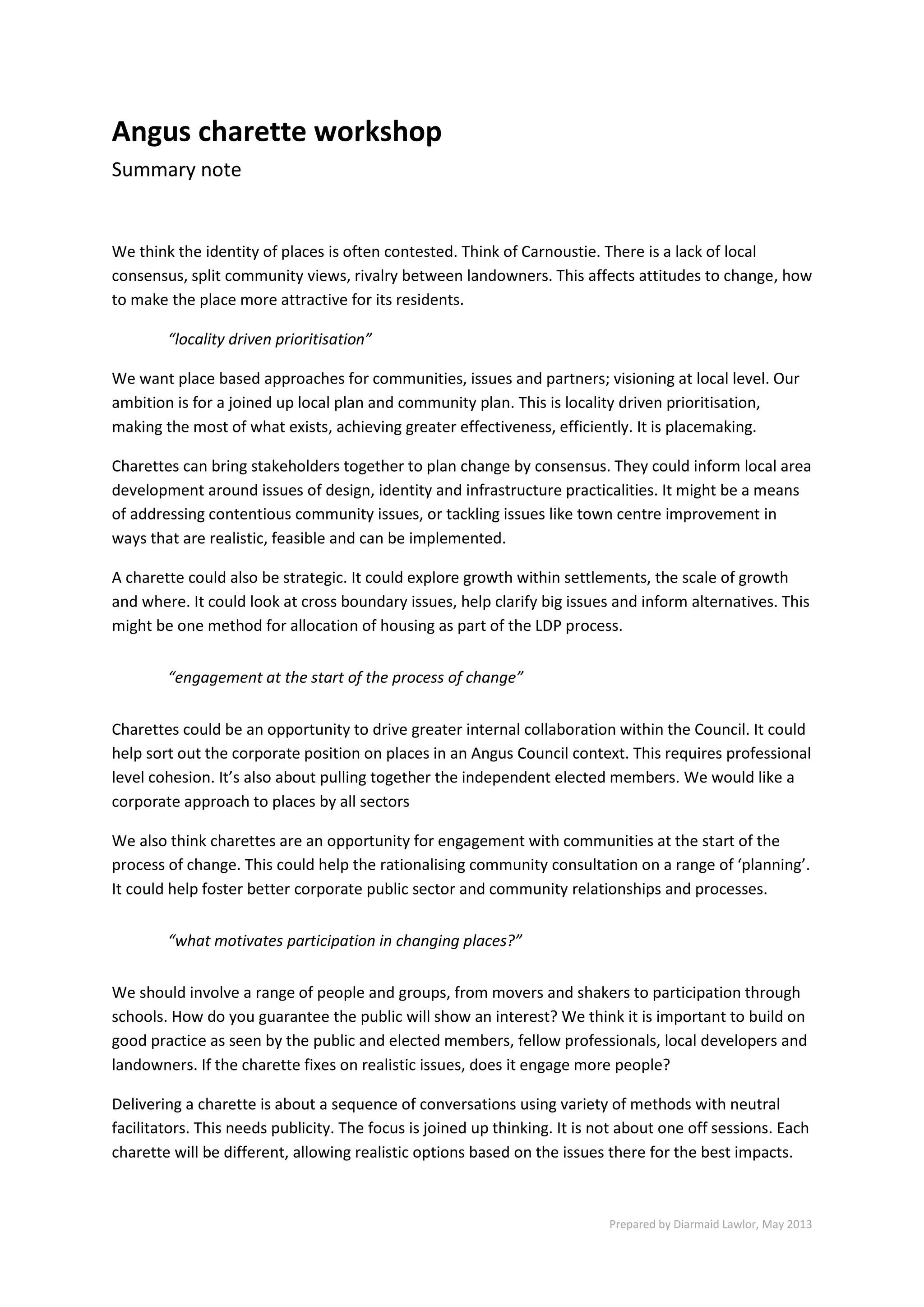 A charette workshop was proposed to bring stakeholders together to plan changes to places through consensus building. Charettes could help address contentious issues in communities and inform local development plans by exploring issues of local identity, design, and infrastructure practicalities. The goal is for charettes to result in an agreed way forward that most people are comfortable with by fostering ownership around a collective understanding of issues affecting a place.