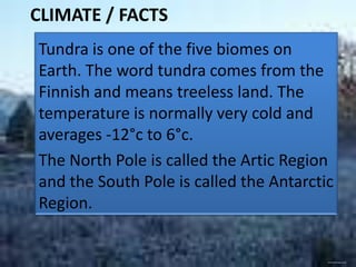 The document summarizes key information about tundra biomes. Tundra has very cold temperatures averaging between -12°C to 6°C and is located near the Arctic and Antarctic circles. It is home to various animal species that are adapted to the cold, including Arctic foxes, polar bears, caribou, and reindeer. Tundra has limited plant life consisting of small bushes, mosses, and berries due to the harsh climate.
