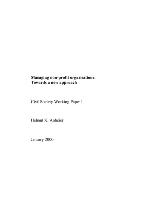 The document discusses the need for a new approach to managing non-profit organizations. It argues that current management theories are ill-suited because they are based on wrong assumptions about how non-profits operate. The author proposes a model that views non-profits as having multiple bottom lines beyond economic factors, including values and politics. It also sees non-profits as evolving systems that encounter dilemmas. The author argues for a comprehensive management approach that accommodates the distinct challenges faced by non-profit organizations.