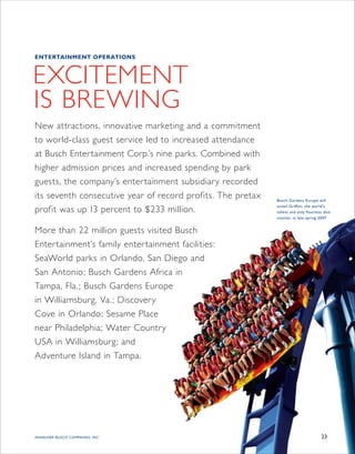 SeaWorld, Busch Gardens, and Discovery Cove had their seventh consecutive year of record profits due to increased attendance from new attractions, marketing, and improved guest service. More than 22 million guests visited their nine family entertainment parks, which include SeaWorld parks in Orlando, San Diego, and San Antonio; Busch Gardens in Tampa and Williamsburg; Discovery Cove in Orlando; and others. The company is constructing a new water park called Aquatica in Orlando set to open in 2008.