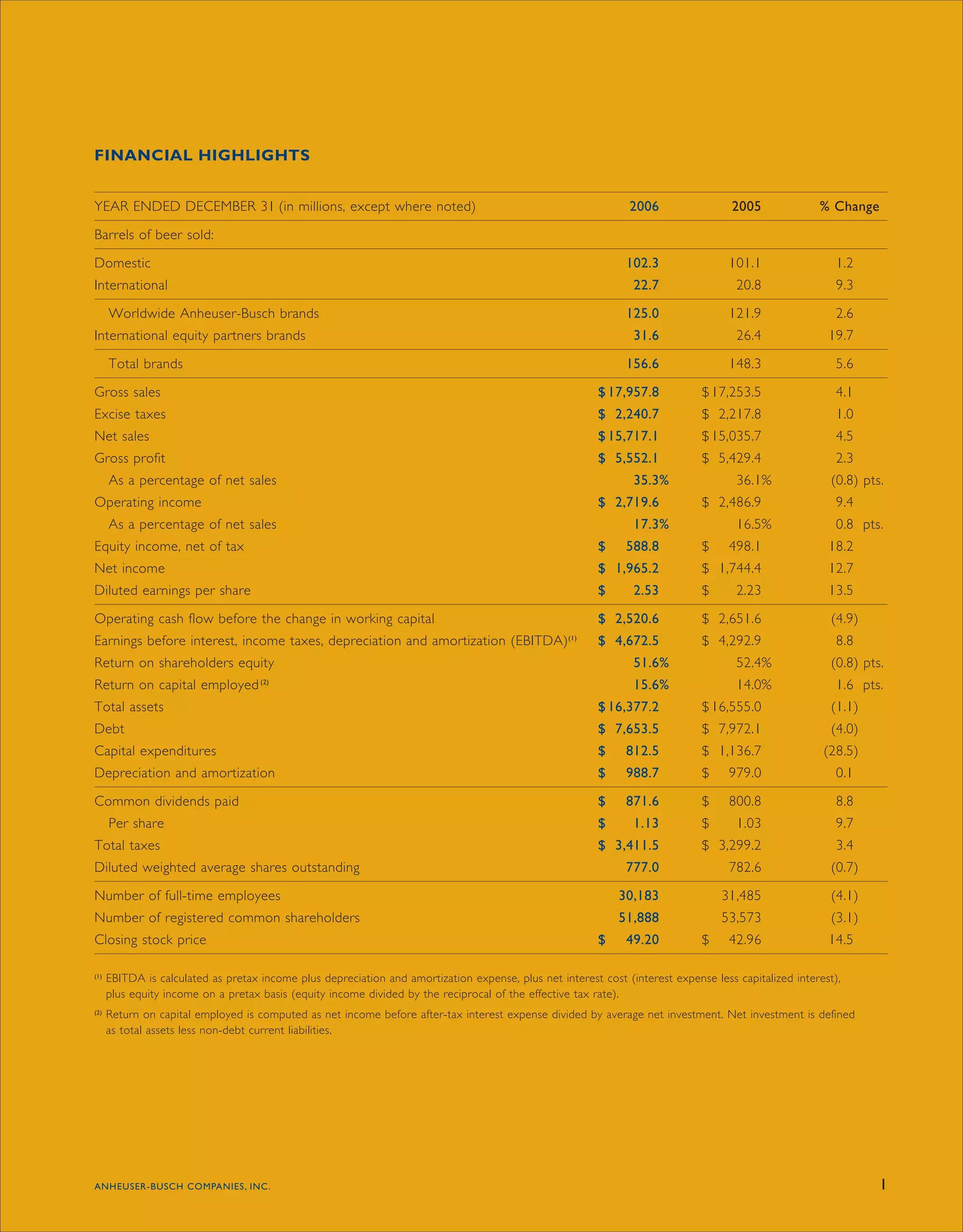 - In 2006, Anheuser-Busch's worldwide beer sales increased 2.6% to 125 million barrels, while sales from international partners grew 19.7% to 31.6 million barrels. Total worldwide beer sales increased 5.6% to 156.6 million barrels. - Net sales increased 4.5% to $15.7 billion in 2006. Net income grew 12.7% to $1.965 billion and diluted earnings per share rose 13.5% to $2.53 per share. - Operating income increased 9.4% to $2.719 billion in 2006, representing 17.3% of net sales, an increase of 0.8 percentage points over 2005.