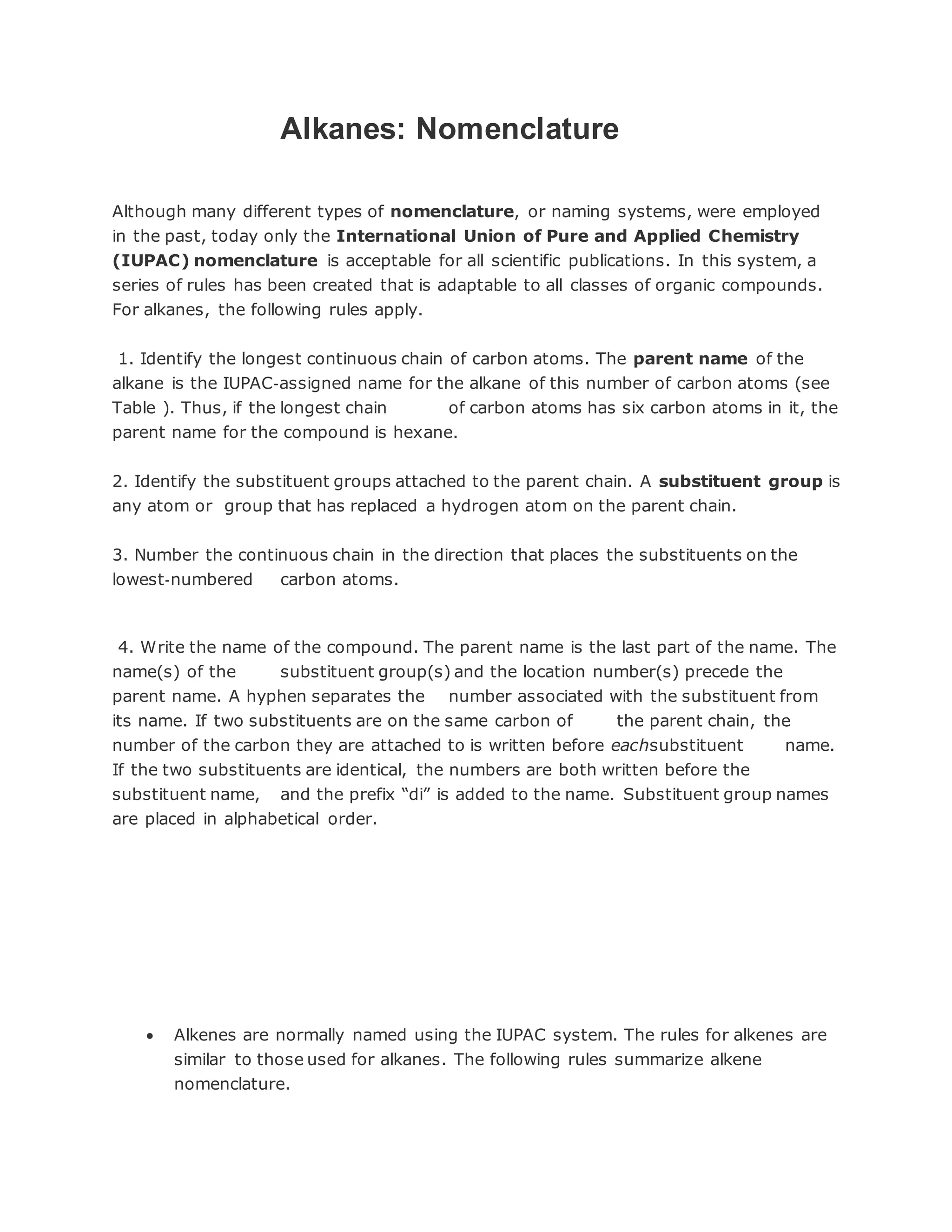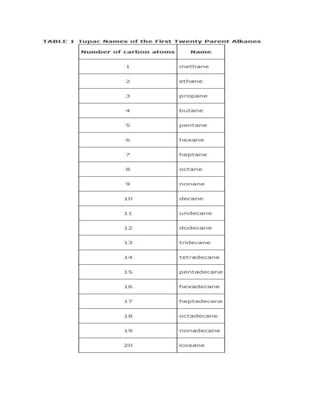 This document discusses the IUPAC system for naming organic compounds such as alkanes, alkenes, and alkynes. It provides rules for determining the parent chain and numbering carbons to indicate substituent locations in the name. Alkanes are named by identifying the longest carbon chain and substituents. Alkenes and alkynes are similarly named but use -ene and -yne endings and indicate double or triple bond positions. The document also discusses isomers such as constitutional isomers that differ in bond connections and stereoisomers that have the same connections but different spatial arrangements.