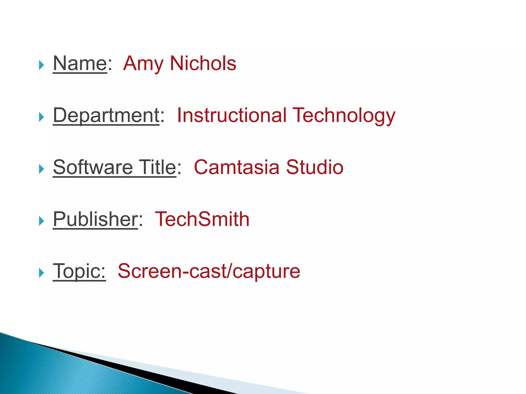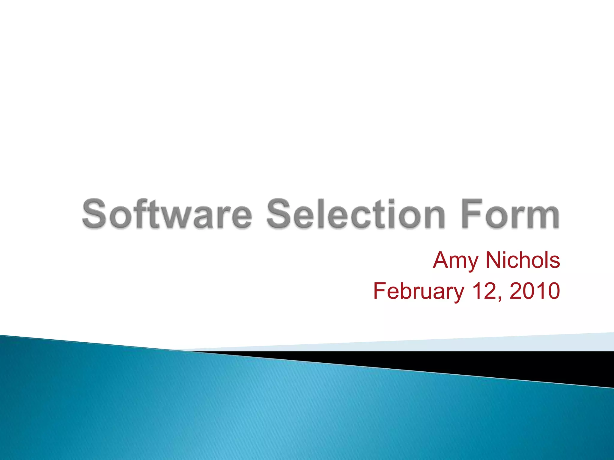 This software selection form recommends Camtasia Studio for creating screen capture tutorials and presentations. It will allow up to 20 users on 20 computers under a multi-pack license for $3500, whereas Adobe Captivate would cost $16,000 and Jing Pro $299 per year. Camtasia Studio allows recording the screen, editing captures, and narrating or leaving sound off. The goals are to let teachers create demonstrations for students and have students make presentations using screen capturing software.