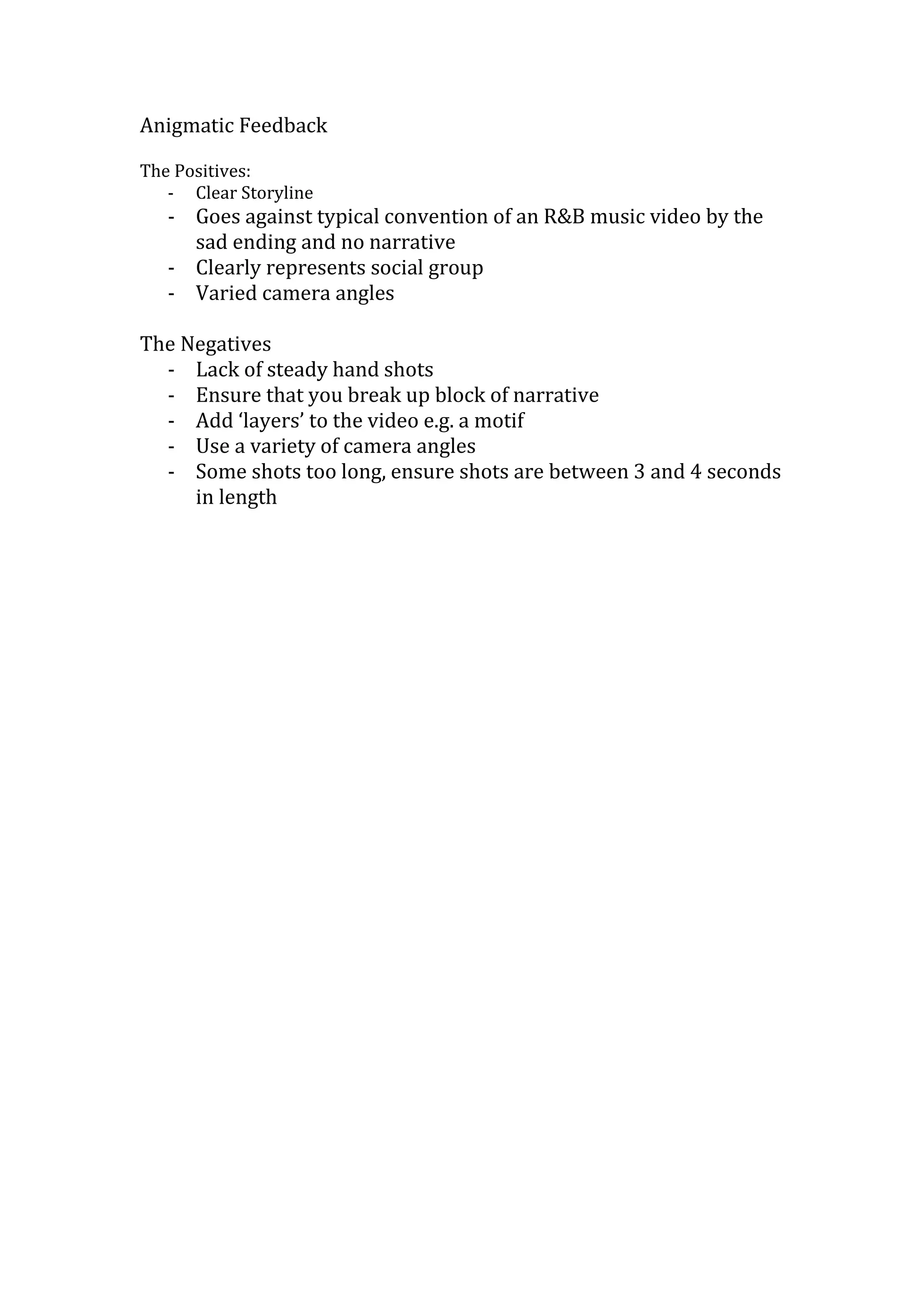 This document provides feedback on an R&B music video, praising its clear storyline, representation of a social group, and use of varied camera angles. It suggests adding more handheld shots, including motifs to add layers, and varying shot lengths between 3 to 4 seconds to improve the video.