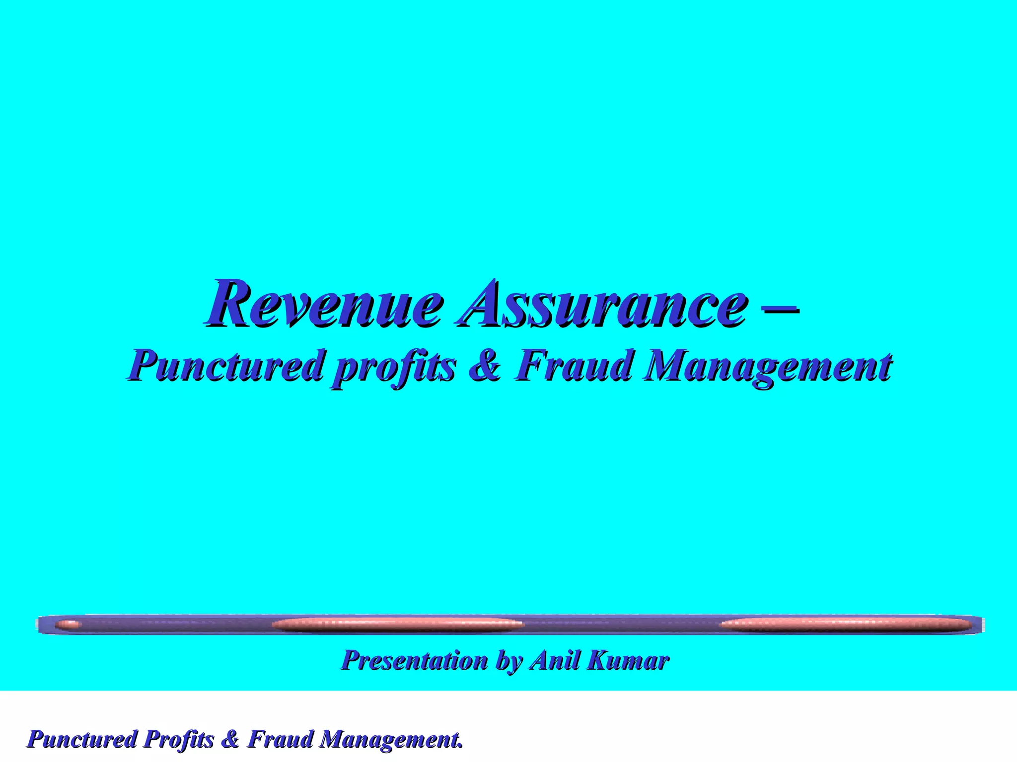 The document discusses revenue assurance and fraud management in the telecom industry. It outlines various points in the service cycle where revenue leakage and fraud opportunities can occur, including developing and pricing products, network infrastructure, service provisioning, rating and billing, collections, and revenue reporting. Examples of past corporate frauds like Enron and Worldcom are provided as warnings. Prevention techniques for common frauds are also suggested.