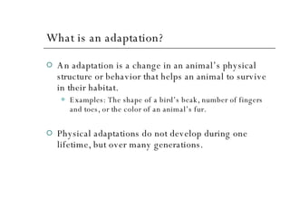 The document discusses animal adaptations and provides examples. It explains that adaptations are physical or behavioral traits that help animals survive in their habitat, such as a bird's beak shape or an animal's fur color. Physical adaptations develop over generations, not in a single lifetime. Examples of animal adaptations include teeth shapes relating to diet and leg or foot structures relating to locomotion. Defense adaptations like camouflage, bright colors, quills or horns are also discussed. Specific animal adaptations for lions, giraffes, and zebras are then outlined.