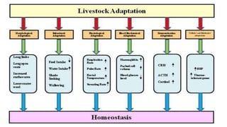 This document discusses various structural and morphological adaptations that allow livestock to better cope with environmental stresses like heat. It describes how species and breeds have adapted traits like sweat glands, hair coat, skin pigmentation, and body size. Bos indicus cattle tend to have more sweat glands and shorter, sleeker coats than Bos taurus breeds. These traits enhance heat dissipation through evaporative cooling. The document also notes buffalo have fewer adaptations for heat tolerance compared to cattle. Overall, the document outlines the key physical features livestock have evolved to regulate body temperature under different climatic conditions.