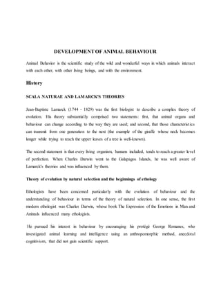 This document discusses the development of animal behavior. It covers the history of theories on animal behavior from Lamarck's theories of evolution to modern ethology. Key concepts discussed include innate versus learned behavior, imprinting, instinctive behaviors, and how behaviors change with maturation. Theories on behavioral development such as preformation, epigenesis, and equifinality are also summarized.