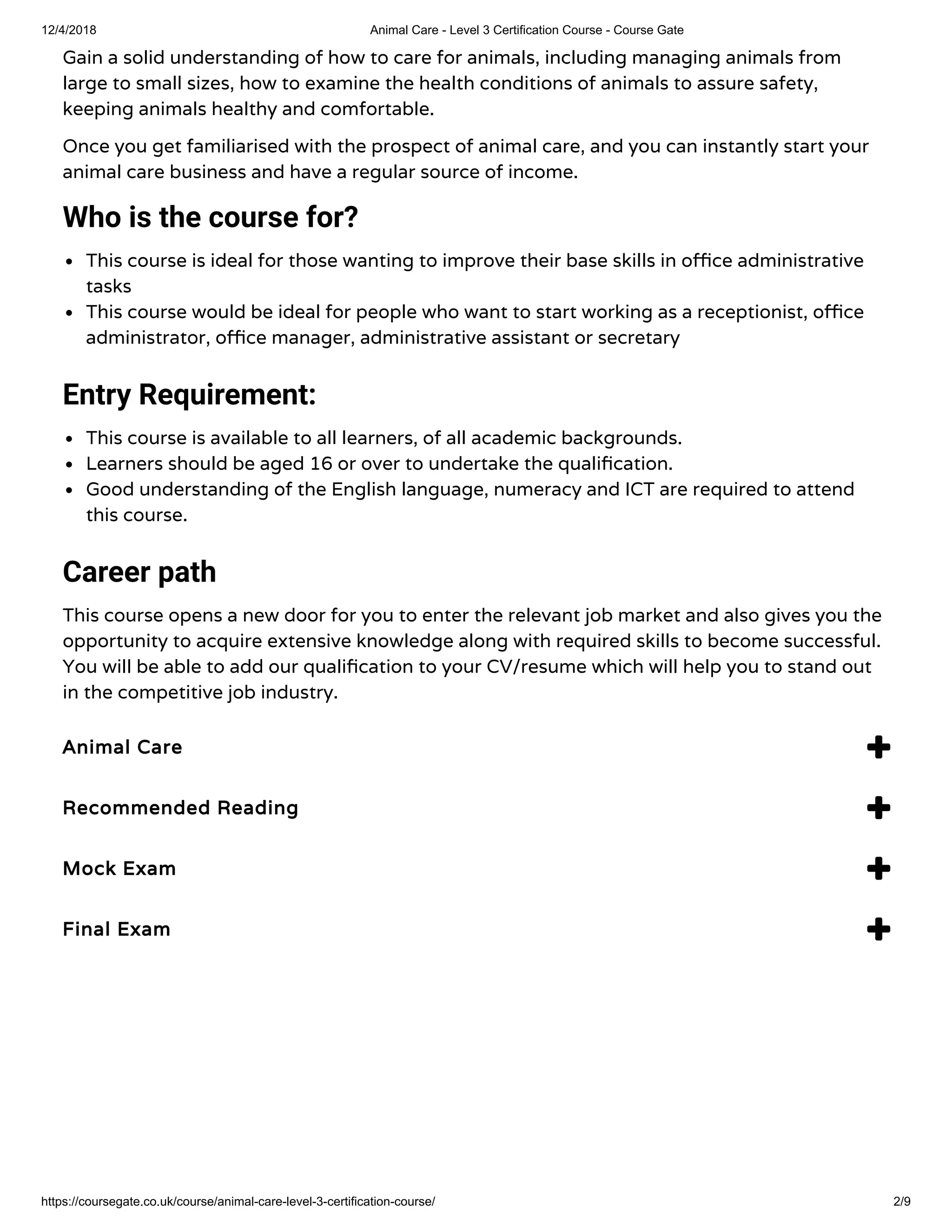 The Animal Care Level 3 Certification Course is designed to provide students with essential knowledge and skills for a successful career in animal care, covering various aspects from health management to business opportunities. The course is accessible to learners aged 16 and above, regardless of academic background. Completing the course enhances job prospects and offers a qualification beneficial for standing out in the competitive job market.