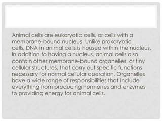 Animal cells are eukaryotic cells that contain a nucleus which houses DNA. Unlike prokaryotic cells, animal cells contain membrane-bound organelles that carry out specialized functions. Organelles in animal cells include the cell membrane, cytoplasm, nucleus, endoplasmic reticulum, Golgi apparatus, lysosomes, mitochondria, and vacuoles. Each organelle performs important roles for normal cell functioning such as transport, metabolism, and waste removal.