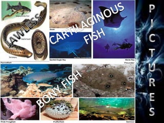 The document summarizes the characteristics of different classes of fish. It discusses three main classes of fish: [1] Bony fish, which make up 95% of all fish and have skeletons made of bone; [2] Cartilaginous fish like sharks that have skeletons made of cartilage; and [3] Jawless fish like lampreys that do not have true jaws. The majority of fish fall under the class of bony fish.