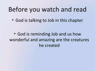 God reminds Job of the unique animals he has created in this chapter. God questions Job about various animals' traits and behaviors, including mountain goats, deer, donkeys, oxen, ostriches, horses, eagles, and hawks. God highlights each animal's distinct characteristics and abilities, showing Job that God endowed each creature with its own skills and nature. The chapter aims to impress upon Job God's immense power and wisdom in creating such a diverse natural world.
