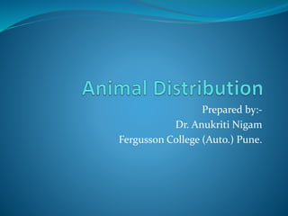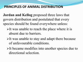 This document discusses principles of animal distribution and barriers to animal distribution. It outlines several laws and principles that govern how animals are distributed, including that animals are generally found where they are best adapted, and barriers like oceans can prevent distribution to new areas. Barriers to distribution are categorized as extrinsic, like physical geographic barriers and climate, or intrinsic, stemming from animal behaviors. Different patterns of distribution are also described, such as continuous, discontinuous, and Arctic/polar distributions.