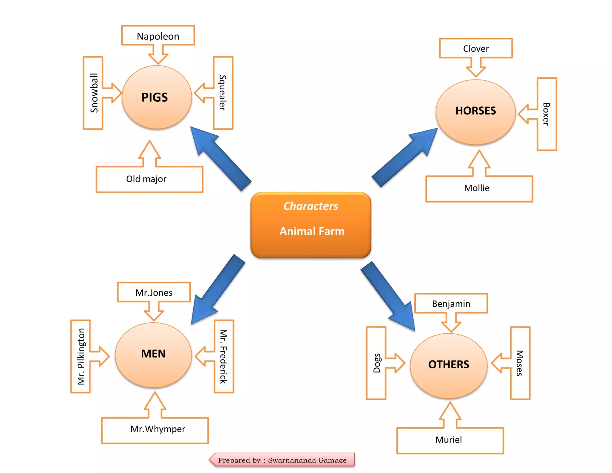 The document outlines the characters of 'Animal Farm' by George Orwell, including key figures such as Napoleon, Snowball, and Squealer, as well as various animals and humans like Boxer, Clover, and Mr. Jones. The characters play significant roles in the allegorical narrative of the farm's politics and society. Overall, it serves as a guide to understanding the interactions and relationships among the diverse cast within the story.