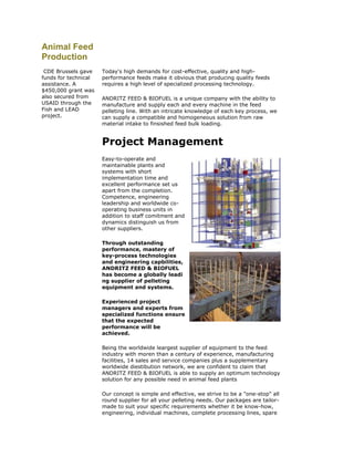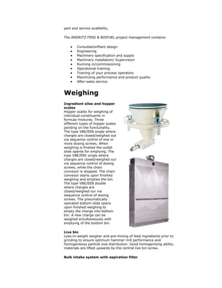 The document discusses Andritz Feed & Biofuel, a company that provides complete systems and solutions for animal feed production. They have over a century of experience in manufacturing equipment for each step of the feed production process from intake of raw materials to packaging of the final feed product. Their solutions include specialized machines, complete processing lines, automation systems, and after-sales services.