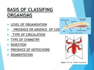 This document provides information on different animal kingdoms and phyla. It discusses key characteristics of porifera, cnidaria, ctenophora, platyhelminthes, aschelminths, annelida, arthropoda, mollusca, echinodermata, hemichordata, chordata, cyclostomata, chondrichthyes, osteichthyes, amphibians, reptiles, aves, and mammalia. For each group, example organisms are given and distinguishing features such as body plan, symmetry, digestive system, and more are described.