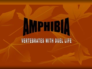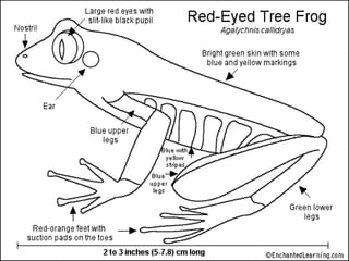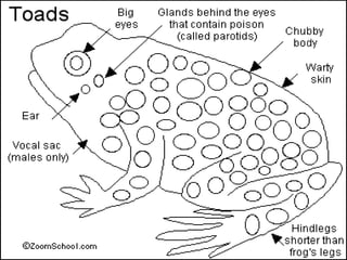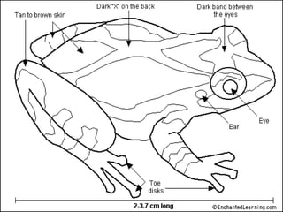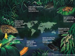 This document discusses several species of amphibians including the cane toad, golden toad, bullfrog, and leopard frog. It provides details on their physical characteristics, habitat, diet, and conservation status. The cane toad is an invasive species in Australia that has flourished without natural predators. The golden toad was one of the first casualties of global amphibian declines due to factors like habitat loss, pollution, diseases and climate change. Bullfrogs are large predatory frogs found across North America that will eat a variety of prey. Northern leopard frogs are named for their spotted backs and eat insects, worms and smaller animals.