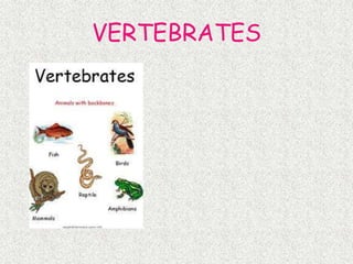 The document discusses the five groups of vertebrates: fish, amphibians, reptiles, birds, and mammals. Vertebrates are animals with backbones and skeletons made of bones. Fish live in water and breathe through gills. Amphibians can live on land or in water, and their young breathe through gills while adults use lungs. Reptiles live on land and breathe through lungs, with scales covering their skin. Birds live in the air and on land, breathing through lungs and having feathers and wings. Mammals live on land or water, breathe through lungs, and have skin or fur covering their bodies.