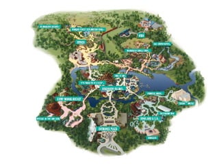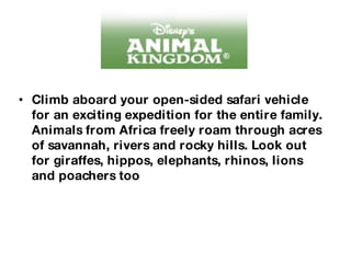 The document describes various attractions at Disney's Animal Kingdom theme park. It provides details about a safari ride where guests can see animals freely roaming the savannah like giraffes, hippos, and elephants. It describes a stage show based on The Lion King featuring songs and characters from the film. It also mentions an insect-themed 3D show where guests can see the world from a bug's perspective and experience overhead spider effects.