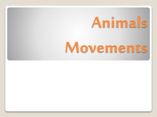 The document discusses how different animals move. Monkeys, elephants, and lions can walk and run while dolphins, whales, and jellyfish can swim. Birds can fly and snakes and worms can slither.