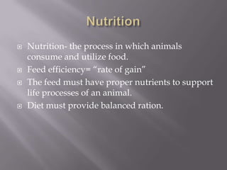 Animal nutrition involves consuming and utilizing food to provide essential nutrients for life processes. A balanced ration must supply carbohydrates, fats, proteins, minerals, vitamins, and water. Carbohydrates provide energy, fats provide heat and energy, proteins build tissues, minerals aid growth and processes, and vitamins regulate processes and growth. There are five main types of diets: maintenance to sustain life, growth for increasing size, reproduction to support breeding, lactation to produce milk, and work when animals perform labor. Proper nutrition is important to maximize feed efficiency, health, and productivity of livestock and companion animals.