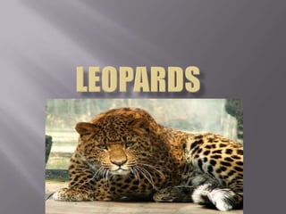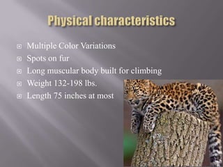 The document describes the leopard, noting that it has multiple color variations and spots on its long, muscular body that is built for climbing trees. Leopards weigh between 132-198 lbs, can be up to 75 inches long, and hunt a variety of prey like gazelles, pigs, primates, and birds in woodlands, mountains, grasslands and savannah at night. They live up to 13 years and can drag large animals like wildebeests up trees, with cubs weighing less than 1 kg at birth.