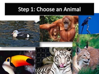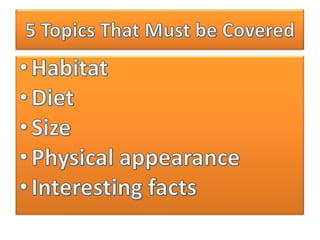The document provides instructions for a school animal research project. Students are asked to research five topics - habitat, diet, size, physical appearance, and interesting facts - about their assigned animal. They will organize this information into a premade book, then present their findings to the class as if teaching the other students about their animal. An example video of a student's presentation is provided for reference.
