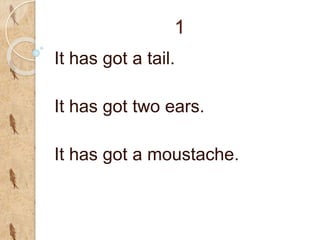 This document contains 13 riddles about different animals with the answers provided at the end. Each riddle provides 3 clues about the animal in 3 sentences or less. The riddles cover a variety of common animals including cats, cheetahs, cows, dogs, ducks, eagles, frogs, giraffes, lions, rabbits, monkeys, wolves, and zebras. The riddles test the reader's ability to identify each animal based on the short descriptions and clues provided.